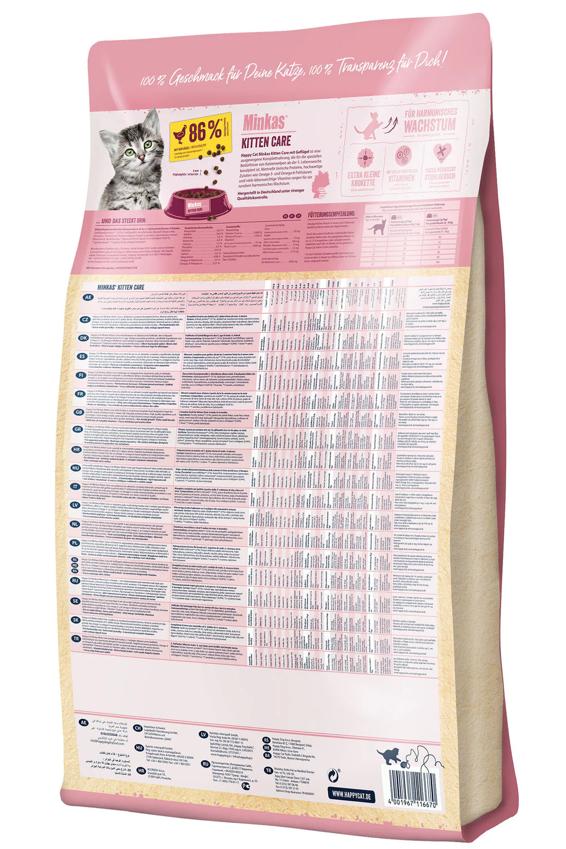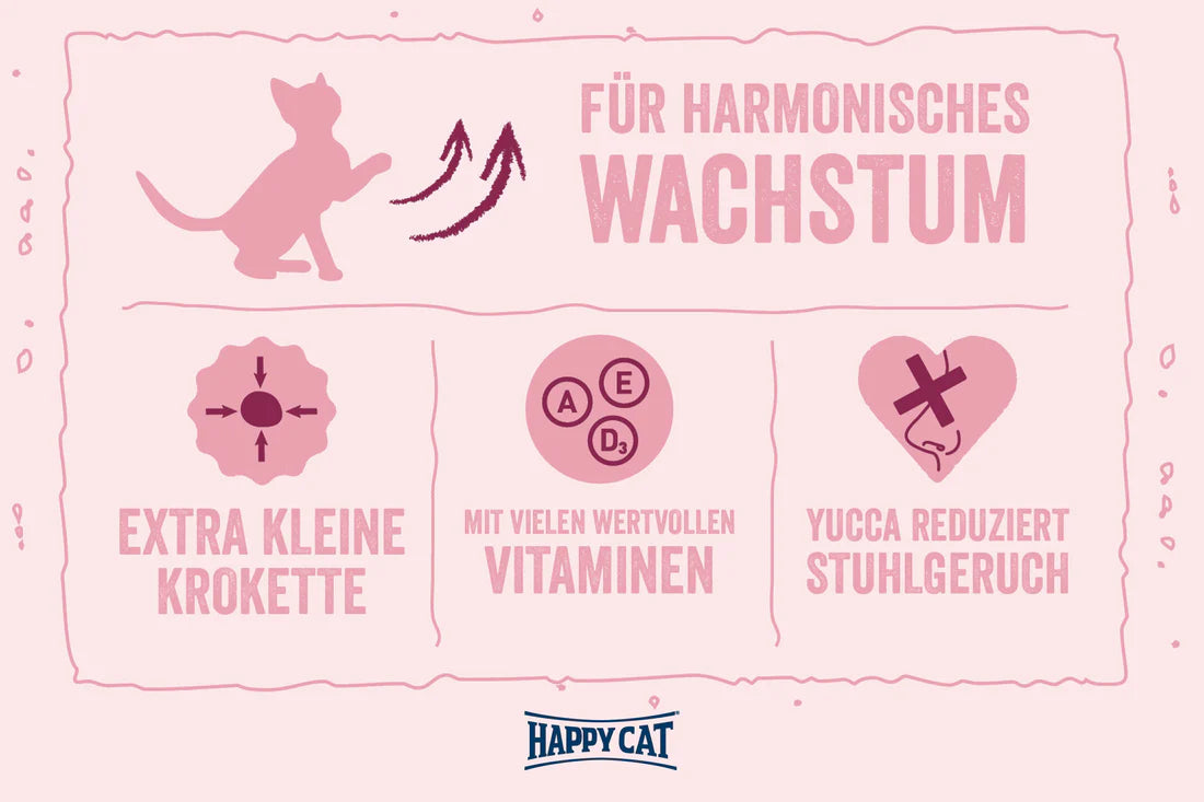 تضمن منتجات Happy Cat Minkas Kitten Care، التي تحتوي على بروتيناتها القيمة ومكوناتها عالية الجودة مثل أحماض أوميجا 3 و6 الدهنية، نموًا متناغمًا شاملاً - متوازن وطبيعي بنسبة 100%. الوصفة، مع الدواجن اللذيذة، مصممة خصيصًا لمتطلبات القطط الصغيرة. يعتبر الطعام الكامل مثاليًا للقطط الصغيرة بدءًا من الأسبوع الخامس، ويوفر لها كل ما تحتاجه. يحتوي هذا الطعام الجاف اللذيذ على الكثير من الفيتامينات، كما أن مستوياته المعدنية مخصصة لدعم نمو القطة. كما أنه يدعم جهاز المناعة. وصفاتنا خالية بشكل طبيعي من النكهات الاصطناعية والمواد الحافظة.