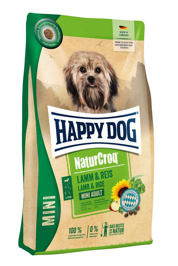 Problems with digestion are a relatively frequent occurrence in dogs. Is your little dog one of those with a sensitive stomach? Then you should select a food for him that offers high digestibility and is suitable for dogs with sensitive stomachs. These include our Happy Dog NaturCroq Mini Lamm & Reis. The best ingredients including easy to digest lamb and stomach-friendly rice pamper your little dog without overloading him. Dried herbs from Bavaria complete the 100 % balanced and species-appropriate dog food recipe.